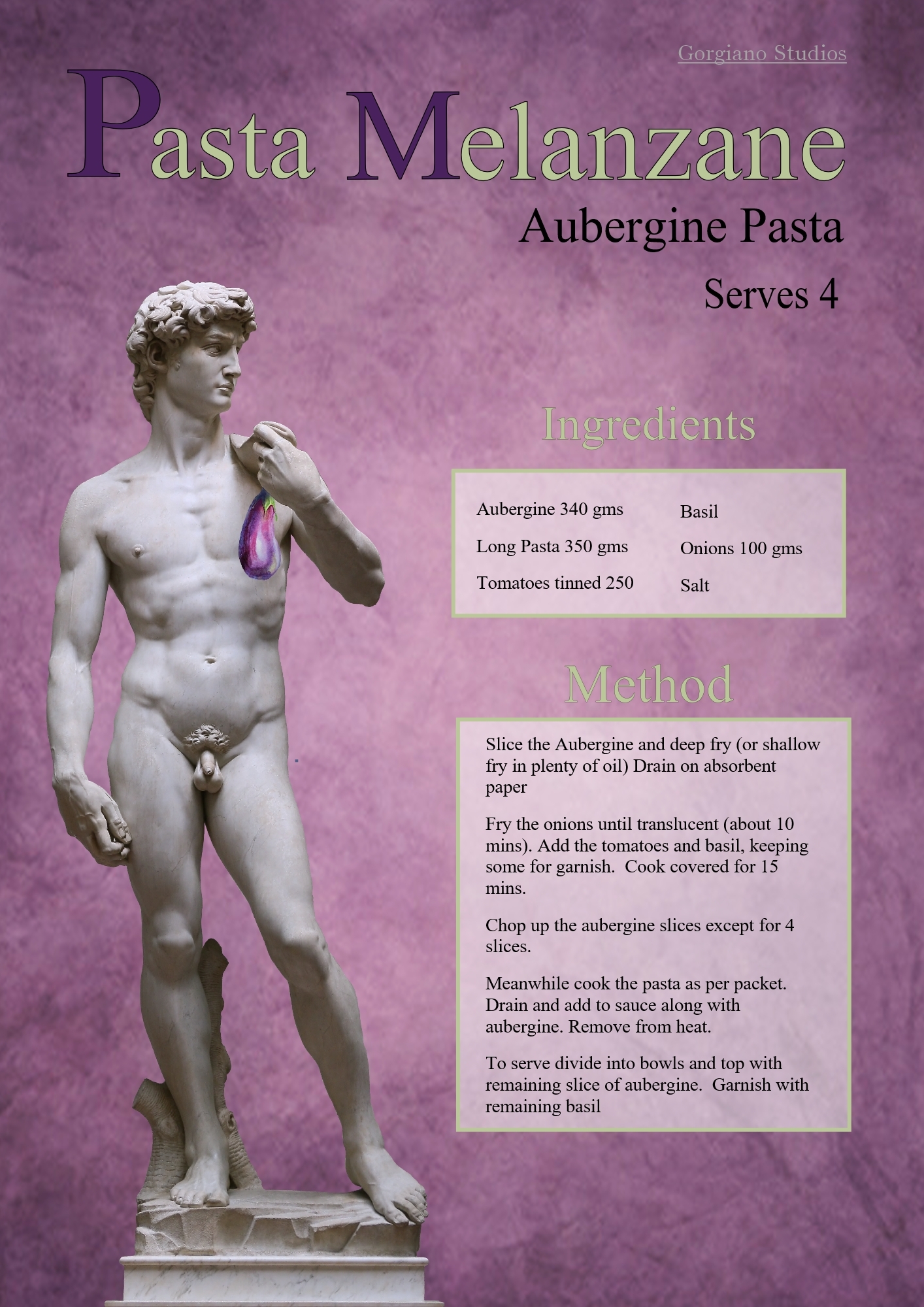 Melanzana pasta recipe from Gorgiano Studios for paintingholidayitaly illustrated by Caroline Crawford