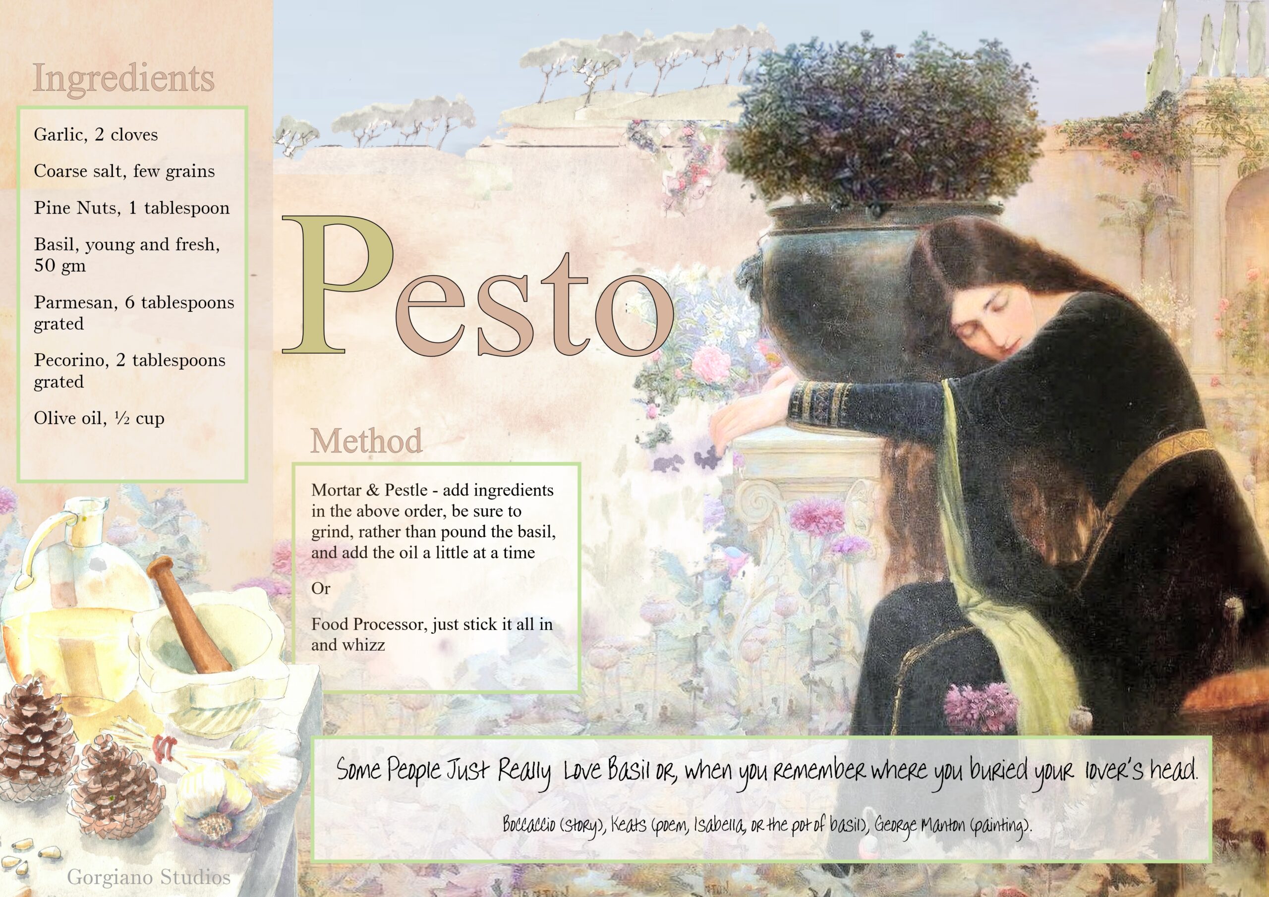 Recipe card for pesto from Gorgiano Studios, illustrated by Caroline Crawford. Crush it